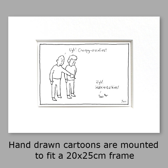 The cartoon measures approx 10 x 15cm, mounted in a deep mount ready to frame in a 20 x 25cm frame.  We do not supply frames but they fit a standard size. See some of our customers framed cartoon images here