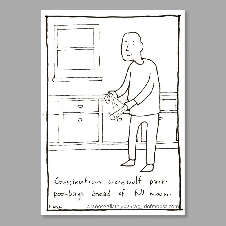 Conscientious werewolf packs poo-bags ahead of full moon.